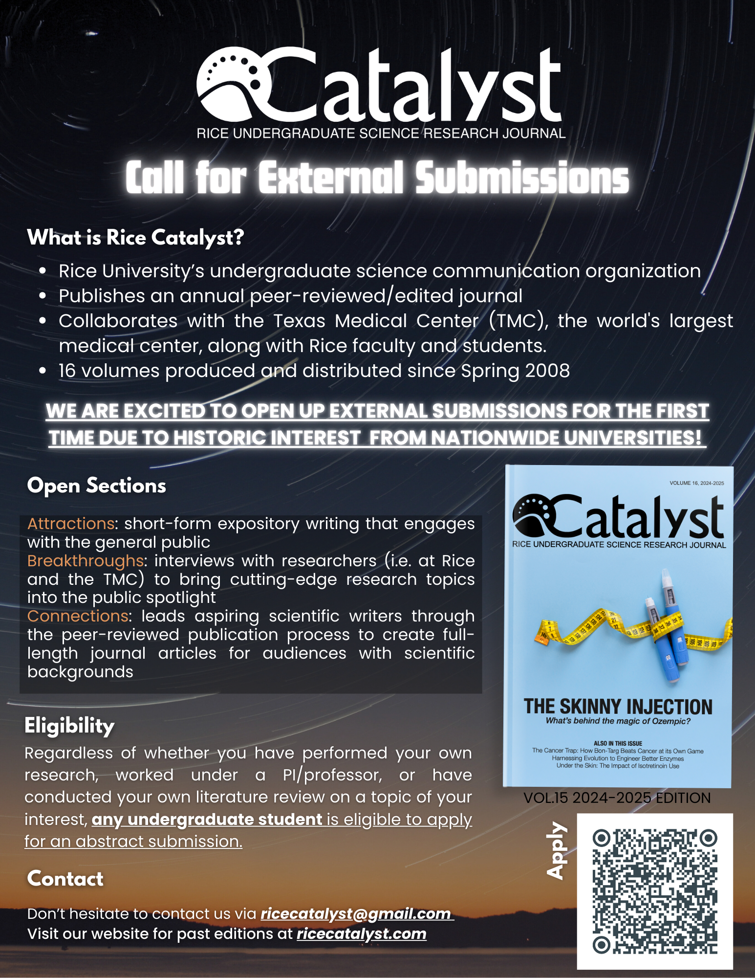 Are you interested in sharing your undergraduate research and hope to publish your work but you’re NOT a Rice student? For 2025-2026 publication cycle, we are opening submissions for abstract calls from outside universities, and we would love the opportunity to share the research that is being performed outside of Rice with our community.